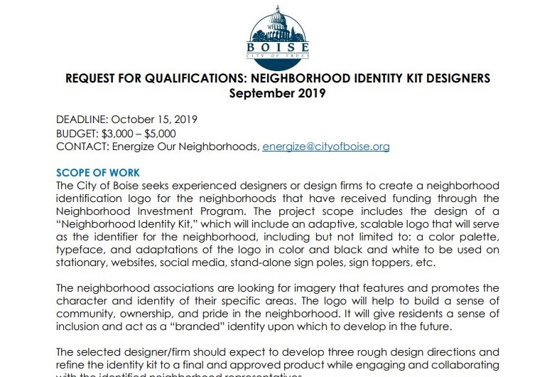 REQUEST FOR QUALIFICATIONS: https://www.cityofboise.org/media/8222/identity-kit-rfq-082319.pdf?fbclid=IwAR00n0kCV1oil1nsY7Y1kU-M8WJNfcGLm2bJQID_KwZwP0YUilQnjAlpCxA